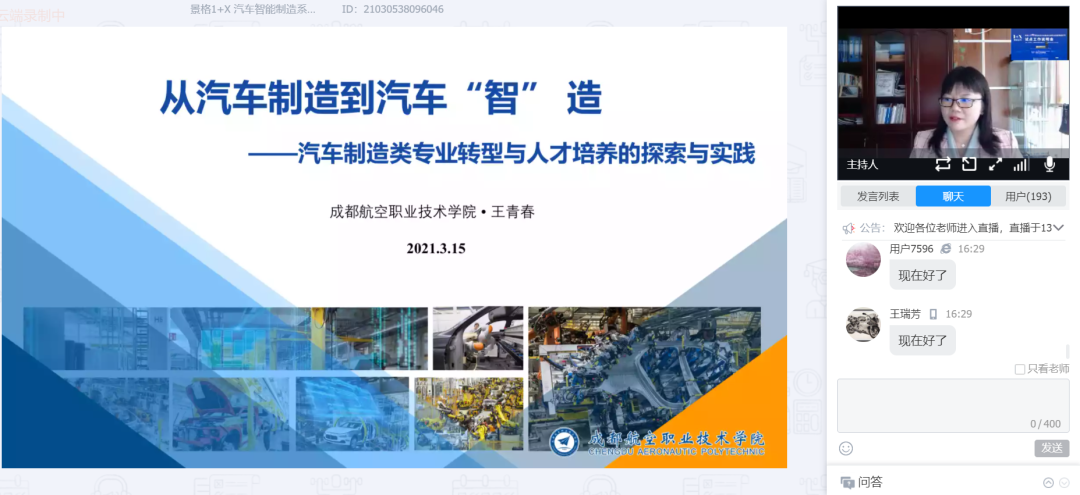 成都航空職業(yè)技術(shù)學(xué)院也作為國家雙高院校,汽車制造與裝配技術(shù)專業(yè)作為重點(diǎn)專業(yè)打造,多年來摸索出新路徑,積極推進(jìn)“1+X”證書試點(diǎn)工作。成都航空職業(yè)技術(shù)學(xué)院汽車學(xué)院王青春院長為我們分享《從汽車制造到汽車“智”造——汽車制造類專業(yè)轉(zhuǎn)型與人才培養(yǎng)的探索與實(shí)踐》,以“課證融通”作為核心進(jìn)行“1+X”證書項(xiàng)目教學(xué)改革與研究,提供包括多專業(yè)的融合、多行業(yè)的應(yīng)用以及人才需求的解讀等方面的思路和方向。