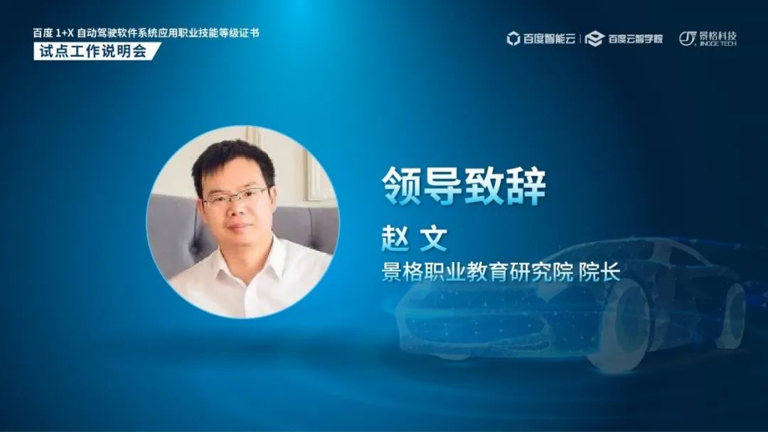 作為此次會議的協辦方,景格職業教育研究院院長趙文致辭。創新改善教育品質,景格在汽車專業人才培養方面,進行了積極探索也卓有成效。多年來憑借景格企業文化、多專業技術、科技研發和創新能力及管理服務水平,在業內形成良好口碑,是教育部現代學徒制、產教融合協同育人企業、同時也是人力資源與社會保障部社會培訓和高質量就業的協同企業,上海市第一批產教融合型培育企業。趙總表示,景格作為試點工作的協助方,一定協助好百度公司,認真努力完成證書各項工作的落地執行。