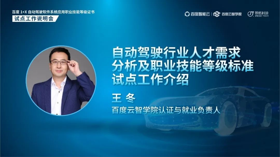 百度云智學院認證與就業負責人王冬為我們分享《自動駕駛行業人才需求分析及職業技能等級標準試點工作介紹》,對自動駕駛軟件系統應用職業技能等級證書后續的工作安排做了非常詳盡闡述,也深入剖析了該證書的行業人才需求,實施方案和路徑等內容,引導院校將培養學生的就業能力,提升到認證標準的能力要求。