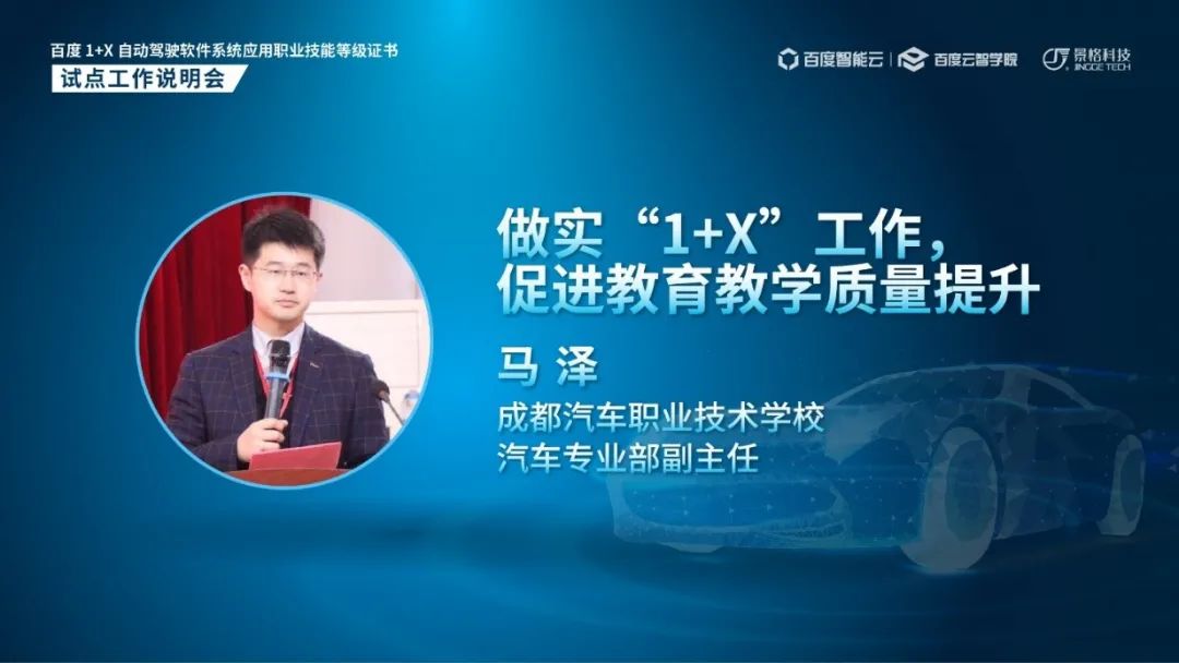 成都汽車職業技術學校,積極推進“1+X”證書教學改革與研究。成都汽車職業技術學校汽車專業部副主任馬澤帶來主題發言《做實“1+X”工作,促進教育教學質量提升》,帶來了新的思路和方向,包括多專業的融合、多行業的應用,以及人才需求的解讀。