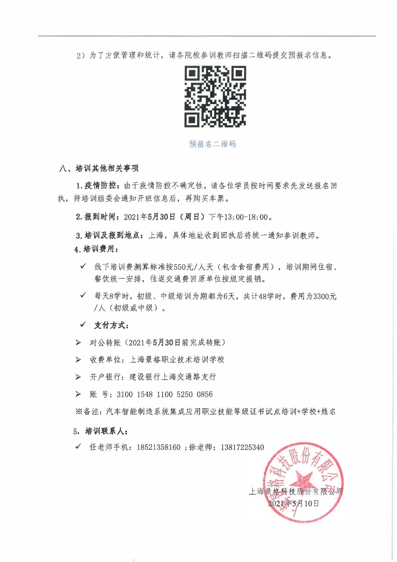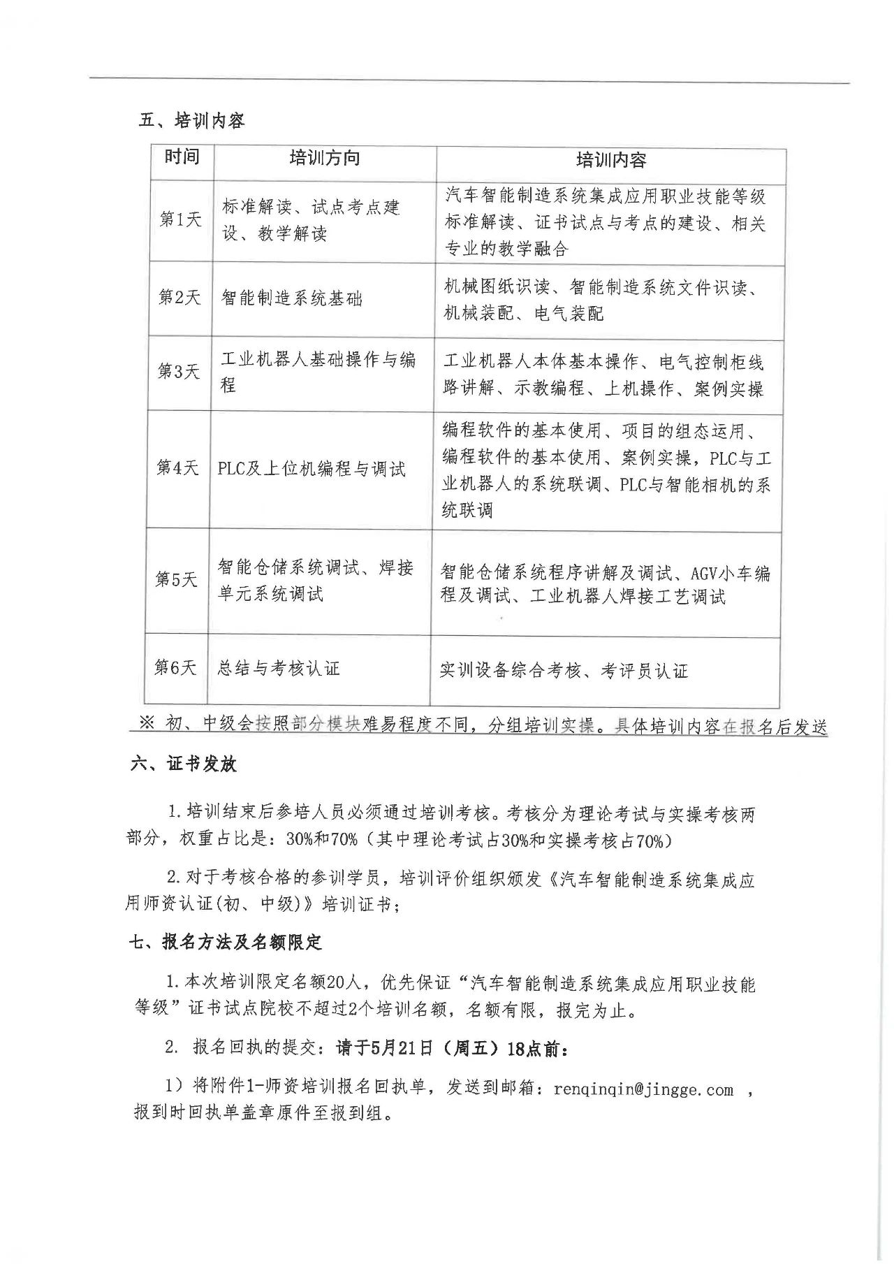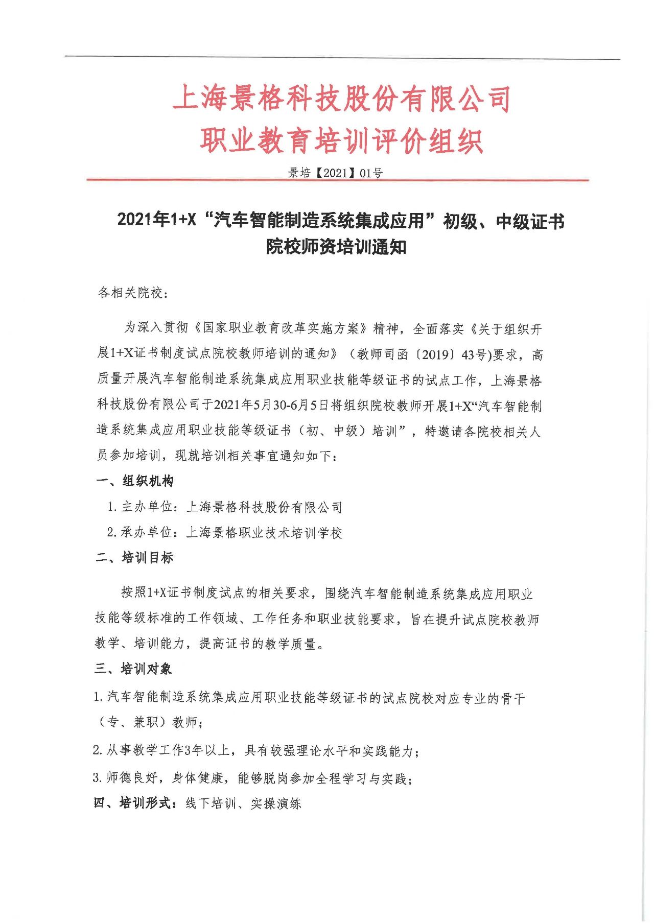 為深入貫徹《國家職業教育改革實施方案》精神,全面落實《關于組織開展1+X證書制度試點院校教師培訓的通知》(教師司函〔2019〕43號)要求,高質量開展汽車智能制造系統集成應用職業技能等級證書的試點工作,上海景格科技股份有限公司于2021年5月30-6月5日將組織院校教師開展1+X“汽車智能制造系統集成應用職業技能等級證書(初、中級)培訓”,特邀請各院校相關人員參加培訓,現就培訓相關事宜通知如下: