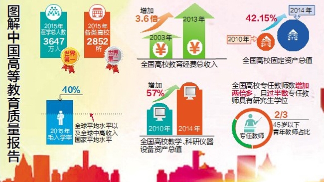 數據顯示,中國高等教育“硬件”建設數量呈井噴式增長,各級各類高校面貌煥然一新。與2003年相比,2013年全國高校教育經費總收入增加了3.6倍。從2010年到2014年底,全國高校固定資產總值增加42.15%,教學、科研儀器設備資產總值增加57%;全國高校專任教師數增加兩倍多,且過半數專任教師具有研究生學位,45歲以下的青年教師占到專任教師總數的三分之二。