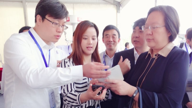 圖為景格展區工作人員為中國汽車維修行業協會陳琦會長下載中職汽修大賽app,在該app中可以及時獲取最新的大賽資訊,觀看往屆冠軍比賽的分享視頻,以及分享自己在大賽中的所感所想。