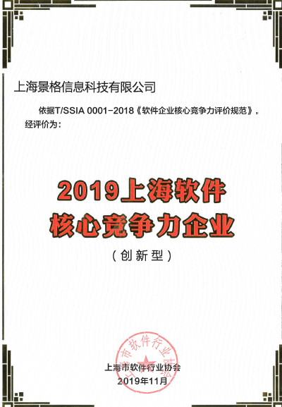 上海景格信息科技有限公司及上海景格科技股份技術(shù)有限公司成功被評為“2019上海市軟件核心競爭力企業(yè)(創(chuàng)新型)”。