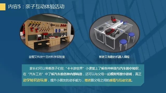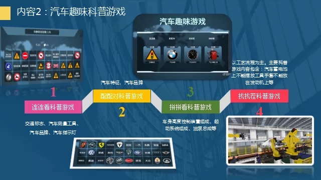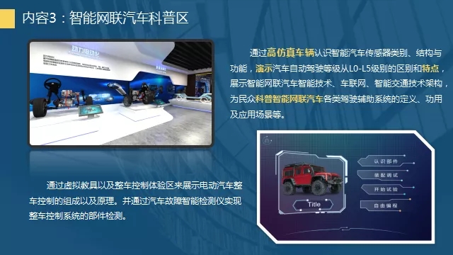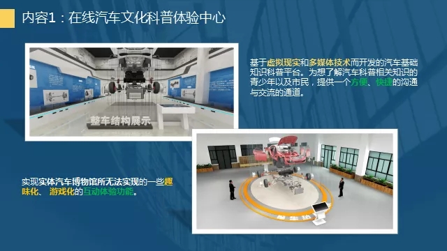 本次展出的活動主題為“探汽車奧秘-創智慧出行”,以VR、AR技術,依托多媒體信息化平臺,通過汽車文化、智能網聯汽車、新能源汽車、智能智造虛擬體驗空間、汽車趣味游戲、親子互動體驗、“互聯網+”等7個方面的多媒體數字化科普活動,向廣大市民傳播汽車文化、構造和動力科普知識;展示三維空間漫游、三維虛擬操控等科技功能;了解物聯傳感和智能故障檢測技術;感受Unity純三維引擎交互技術與VR虛擬現實技術,進行烘焙渲染,輸出的大型超炫虛擬場景,清晰展示汽車的內部構造和運行原理,讓體驗者身臨其境般地探索汽車之旅。