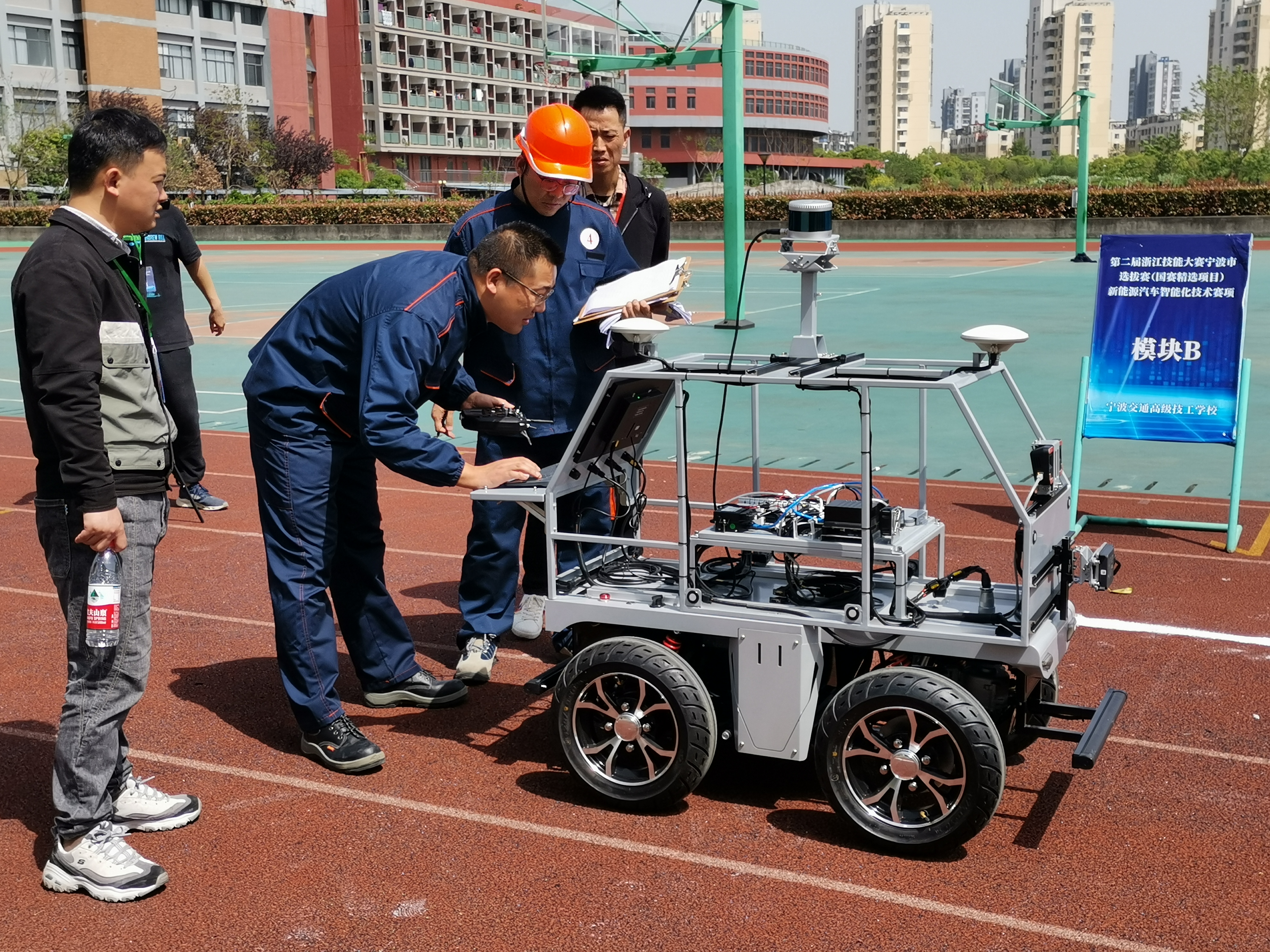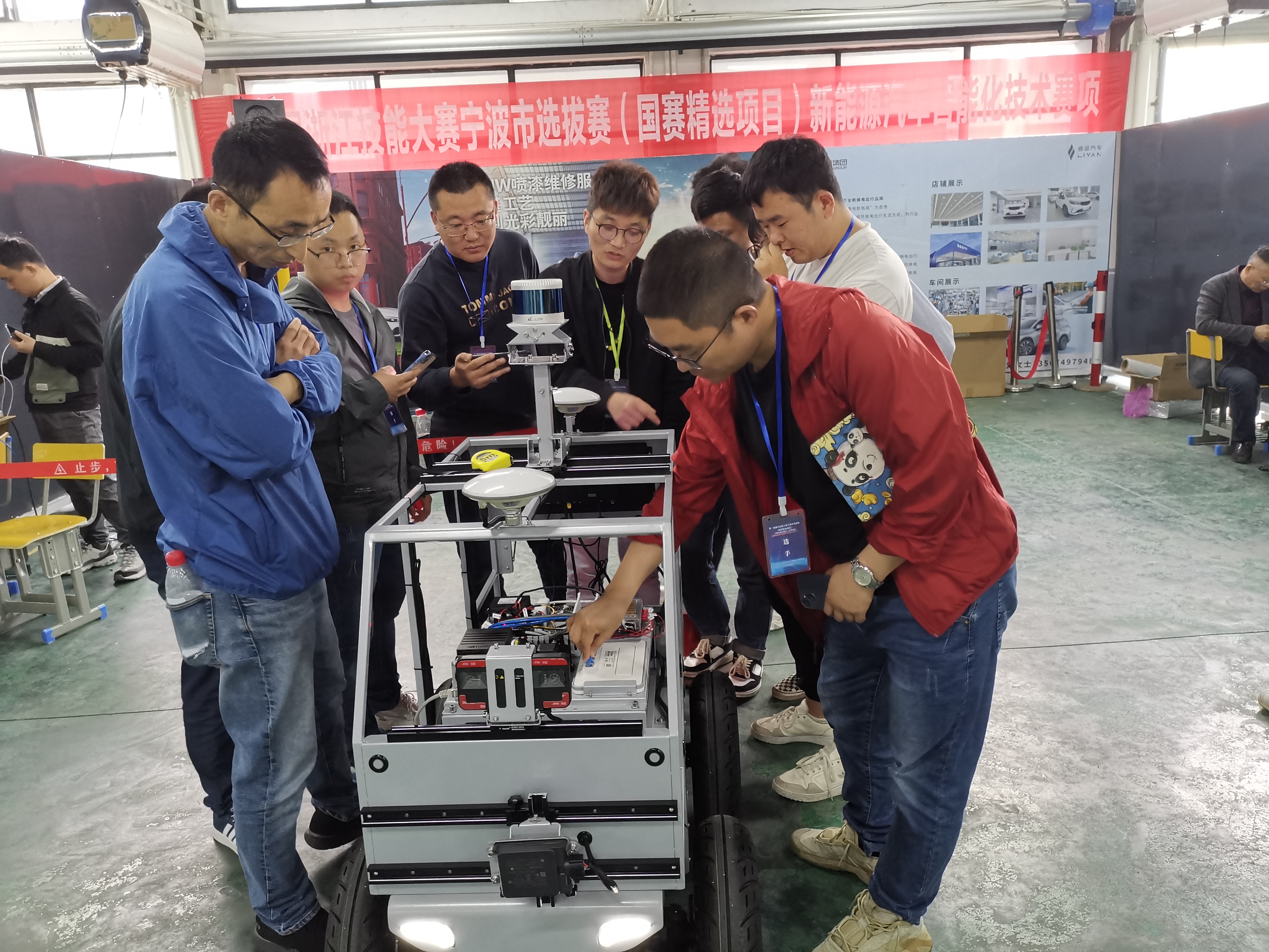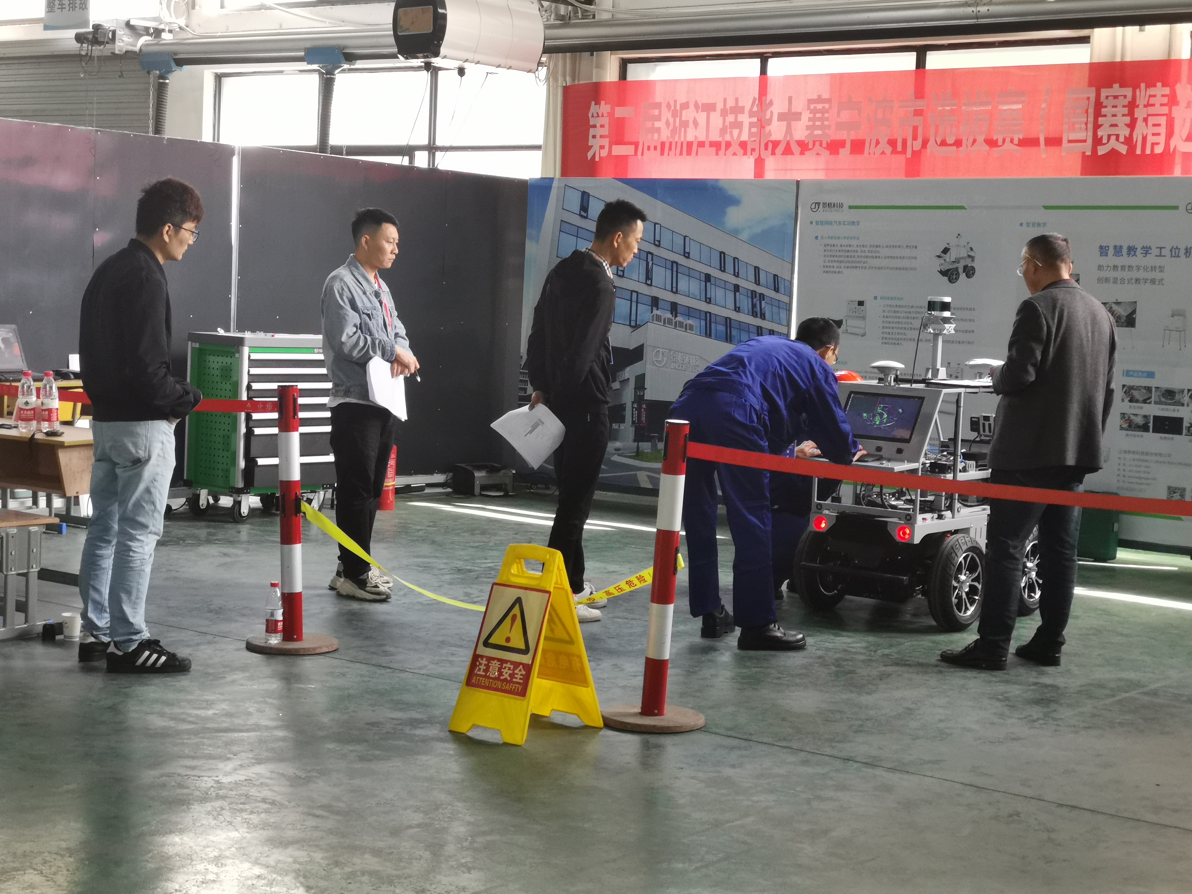 本次選拔賽由寧波市職業技能鑒定指導中心統一命題和選派裁判,來自全市6個代表隊參與,比賽賽程中裁判人員公正執裁,選手們遵守比賽規則和安全操作規程,以飽滿的精神展現了精湛的技藝。景格科技工程師基于智能網聯汽車搭載先進的車載傳感器、控制器、執行器等裝置,融合現代通信 與網絡技術,實現車與車、車與人、車與路、車與云的智能信息交換、共享,從復雜環境感知、 智能決策、 協同控制等功能, 讓參賽選手實現安全、高效、舒適、節能行駛的體驗,尤其基于針對智能化和網聯化的車載傳感器,使汽車自主感知、決策和控制運動。在設置故障中讓選手通過網絡通信與外界人、物、環境實現信息交互,使汽車具有環境感知、決策和控制運動能力,實現替代人操作的流程和環節而實現自動駕駛。參賽選手以智能化線傳電動小車為平臺,通過完成智能化感知部件的裝調、智能網聯功能驗證、智能網聯汽車道路自動駕駛測試等作業,考核選手對新能源汽車智能化系統中的傳感技術、網聯通訊技術的理解和解決相關實際問題的綜合能力,引領寧波市汽車制造與維修行業在汽車智能化網聯化方向的高素質前沿技能型人才培養。