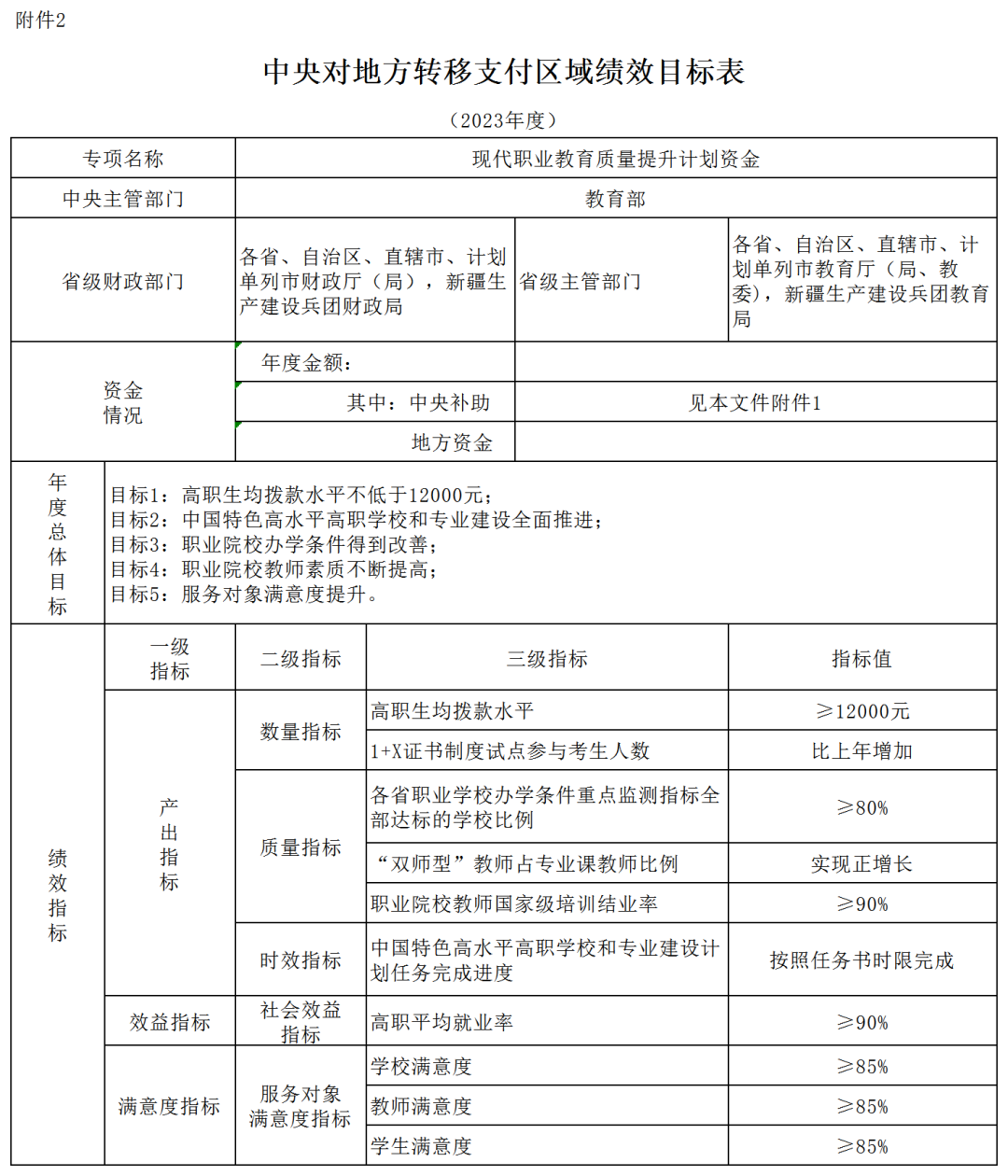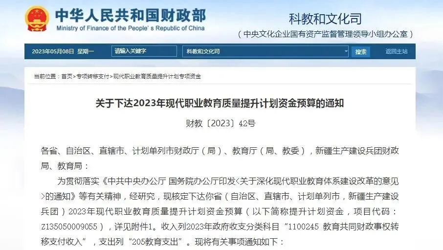 為貫徹落實(shí)《中共中央辦公廳 國務(wù)院辦公廳印發(fā)<關(guān)于深化現(xiàn)代職業(yè)教育體系建設(shè)改革的意見>的通知》等有關(guān)精神,經(jīng)研究,現(xiàn)核定下達(dá)你省(自治區(qū)、直轄市、計(jì)劃單列市,新疆生產(chǎn)建設(shè)兵團(tuán))2023年現(xiàn)代職業(yè)教育質(zhì)量提升計(jì)劃資金預(yù)算(以下簡稱提升計(jì)劃資金,項(xiàng)目代碼:Z135050009055),詳見附件1。收入列2023年政府收支分類科目“1100245 教育共同財(cái)政事權(quán)轉(zhuǎn)移支付收入”,支出列“205教育支出”。現(xiàn)將有關(guān)事項(xiàng)通知如下: