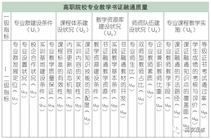 1+X證書制度背景下,對高職院校相關專業書證融通的質量評價是一個復雜的過程,不僅需要評價書證融通的結果,還需要對書證融通的過程、方法、教學、師資、專業和課程建設等方面進行綜合評估。各評價主體應該根據學校和專業的情況以及職業能力等級證書的特點,選取定性和定量相結合的方法,采用適當的量化模型對高職院校相關專業書證融通的范圍、廣度、深度和匹配度等方面進行綜合評價。在構建模型進行評價的過程中,一個重要環節就是根據評價方法和具體實際建立評價指標體系。