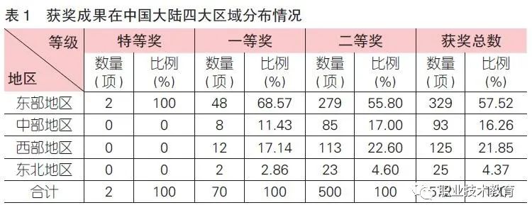 根據國家統計局2011年頒布的《東西中部和東北地區劃分方法》,我國經濟區域劃分為東部、中部、西部和東北四大地區。對第一完成單位所屬地區進行統計,結果顯示:特等獎2項,均在東部地區;一等獎共70項,其中東部地區獲得48項、中部地區獲得8項、西部地區獲得12項、東北地區獲得2項;二等獎共500項,其中東部地區獲得279項、中部地區獲得85項、西部地區獲得113項、東北地區獲得23項。東部地區獲獎總數329項、占比57.52%,超過另外三大地區的獲獎總和,見表1。