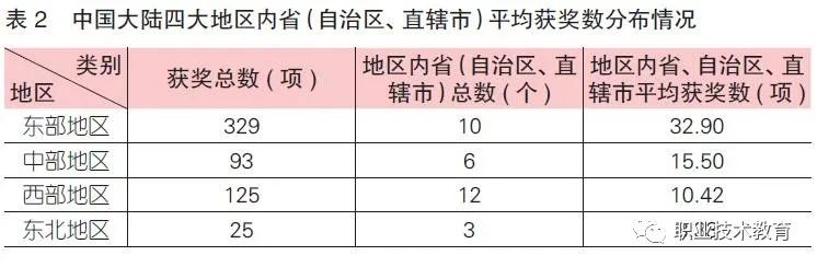 由表1、2可見,獲獎地區的成果獎數量分布極不均衡,東部地區的省(自治區、直轄市)獲獎總數、等級以及平均獲獎總數均遠遠超過中部地區、西部地區和東北地區。這不僅反映出職業教育發展基礎的不均衡,同時也說明了社會經濟水平影響了職業教育的發展。