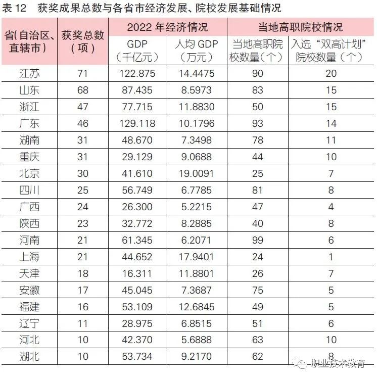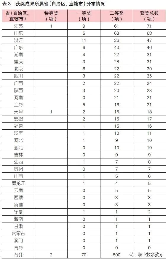 統計數據顯示:本屆職業教育教學成果獎各個省(自治區、直轄市)獲獎情況差異較大,東部省(自治區、直轄市)獲獎等級、獲獎總數及平均獲獎數遠遠超過其他省份,與東北三省差距最大。比如,江蘇、山東、浙江、廣東獲獎總數和等級明顯高于其他省(自治區、直轄市)。其中,江蘇、天津分別獲得特等獎1項,浙江獲得一等獎11項,均位居全國前列。