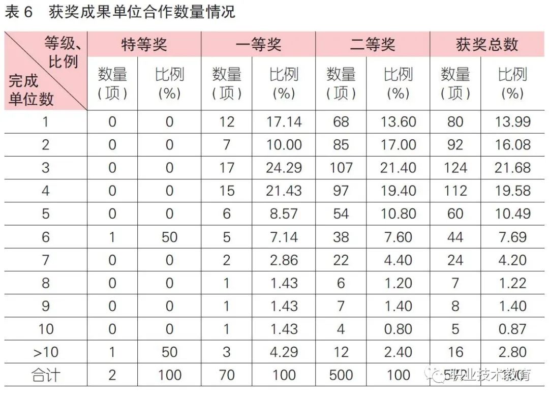 統計數據顯示:獨立完成的成果有80項,由兩個或兩個以上單位合作完成的有492項。其中,3個單位合作完成的成果最多,分別占一等獎、二等獎和獲獎總數的24.29%、21.40%和21.68%。由中國化工教育協會等單位選送的“學習成果框架下石油和化工行業終身教育體系的探索與實踐”,其合作單位有16個,成為本屆成果獎完成單位最多的成果,見表6。