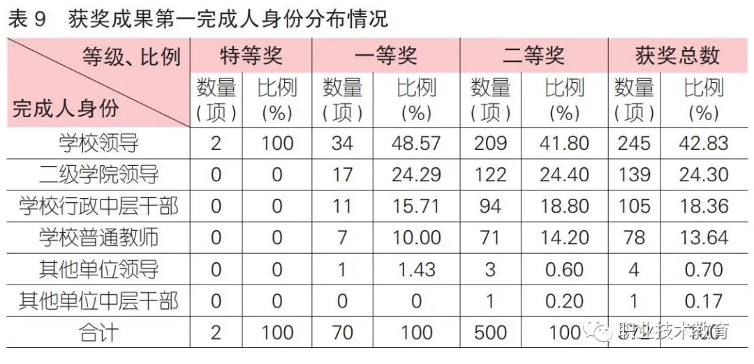 統計顯示:成果第一完成人是校領導的,有2項特等獎、34項一等獎和209項二等獎,獲獎總數為245項、占比42.83%;成果完成人是二級學院領導的,獲獎總數139項、占比24.30%;成果完成人是行政部門中層干部的,獲獎總數105項、占比18.36%;以上三項合計占比85.49%。一線教師獲獎總數78項,占比僅13.64%。可見,校領導和具有學校中層職務的干部,其獲獎比例遠遠高于普通教師。