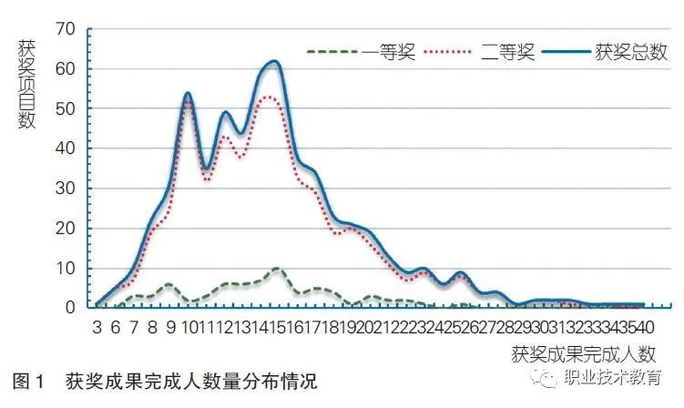 本屆國家級教學成果獎評審工作,對于成果完成人的數量沒有限制。統計顯示,572項獲獎成果由8393人完成,每項成果平均參與人數約15人。細分統計表明,在一等獎、二等獎和獲獎總數的完成人數分布中,完成人數分別為15人、14人和15人,獲獎成果數量最多,見圖1。成果完成人數最多的是廣西壯族自治區教育廳推薦的由廣西桂林農業學校等單位報送的成果“服務區域農業全產業鏈發展的中職創新型現代農業人才培養的研究與實踐”,該項目完成人數達40人;完成人數最少的是由火箭軍士官學校報送的成果“火箭軍士兵教育訓練一體化協作研究與實踐”,該項目完成人數僅為3人。
