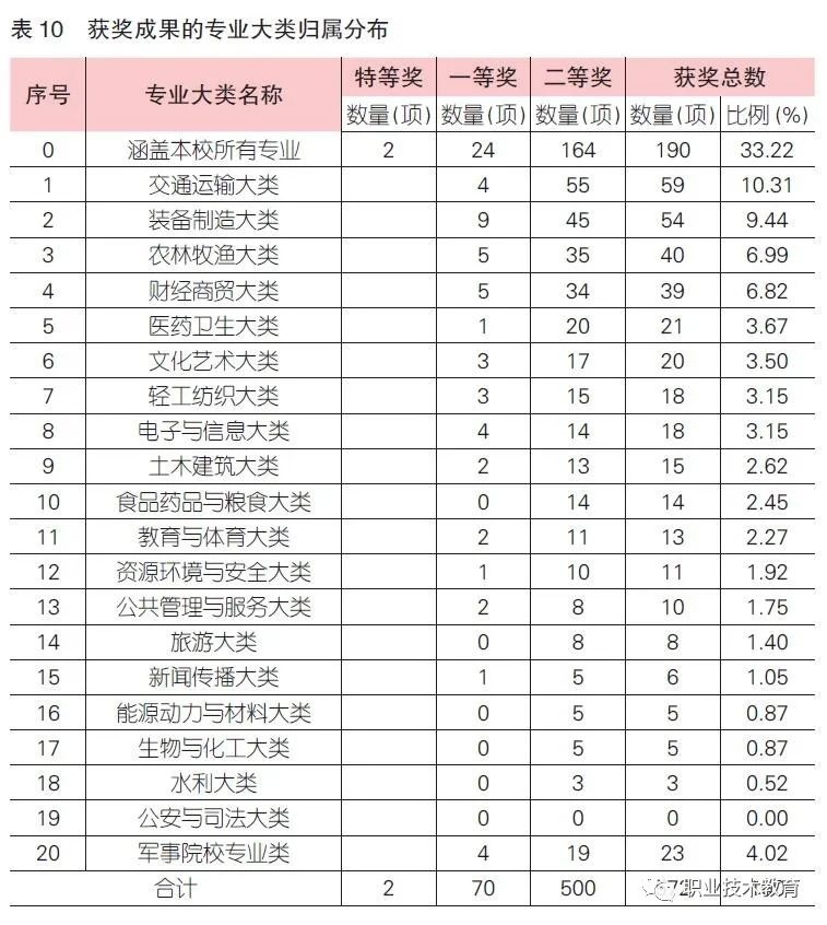本屆教學成果獎獲獎成果除去涵蓋本校所有專業和軍事院校專業外,共涉及19個專業大類(參照《職業教育專業目錄(2021年)》),如表10所示。統計顯示:“涵蓋本校所有專業”的成果特等獎有2項、一等獎有24項、二等獎有164項,獲獎總數占比33.22%;獲獎總數位居前三的專業大類分別為“交通運輸大類”“裝備制造大類”和“農林牧漁大類”,獲獎總數均超過40項,這與我國近年來推進制造強國戰略、交通強國戰略以及重視“三農問題”有關。2項特等獎分別是天津市教育委員會推薦的由天津職業技術師范大學報送的成果“模式創立、標準研制、資源開發、師資培養——魯班工坊的創新實踐”和江蘇省教育廳推薦的由江蘇聯合職業技術學院報送的成果“五年貫通‘一體化’人才培養體系構建的江蘇實踐”。一個涉及高水平開放問題,另一個涉及人才縱向貫通培養問題,這在一定程度上也反映了國家對于職業教育“走出去”戰略和現代職業教育體系建設的高度關注。