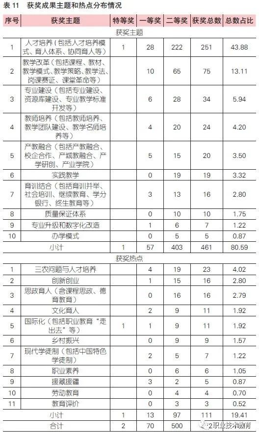 為了緊扣職業教育教學改革主旨,又能回應職業教育熱點問題,獲獎成果名稱多采用“主題+熱點”混合方式,即將熱點問題與人才培養、專業建設、產教融合等主題相結合。統計結果表明,本屆成果獎中熱點問題出現頻數前十位的依次是:“三農問題”“創新創業”“思政育人”“文化育人”“國際化”“鄉村振興”“現代學徒制”“職業素養”“援藏援疆”和“勞動教育”等,尤其是“三農問題”“文化育人”“國際化”“現代學徒制”和“援藏援疆”,獲得了2項及以上的一等獎,這在一定程度上反映了職業教育教學改革的當前關切。