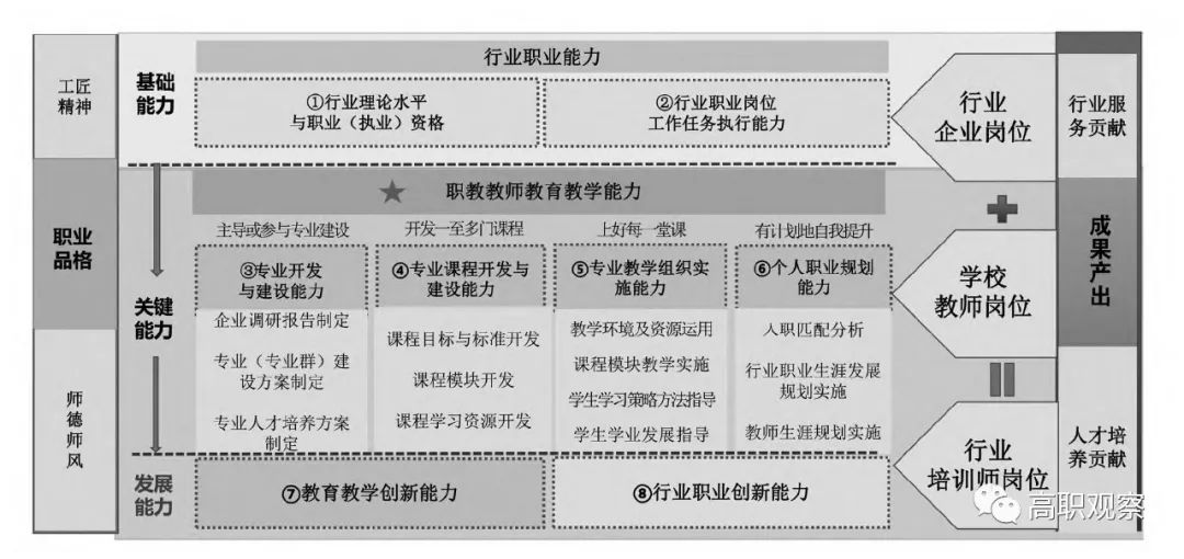 學校要從注重教師職業道德到師德和工匠精神并重,“雙證”達標到注重“雙證雙能”達標,設計工匠之師“品格、能力、生涯發展、社會貢獻”四向雙軌勝任力模型,構建“基礎能力+關鍵能力+創新能力”的職業能力體系及其質量診斷機制。