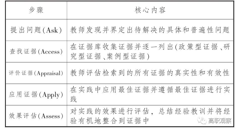 當下教師專業發展的一個重要轉向就是走向“循證實踐”。所謂“循證實踐”即“遵循證據的實踐”,它要求教師專業發展要依據最優的科學研究證據來展開實踐和做出決策,這體現了一種理性精神和科學態度。有研究者建構出“循證實踐”的5A范式(見表1)。可見,教師專業發展的循證實踐理念及其方法對“雙師型”教師專業發展具有重要啟示作用與指導意義,有可能形成“雙師型”教師專業發展的新范式。