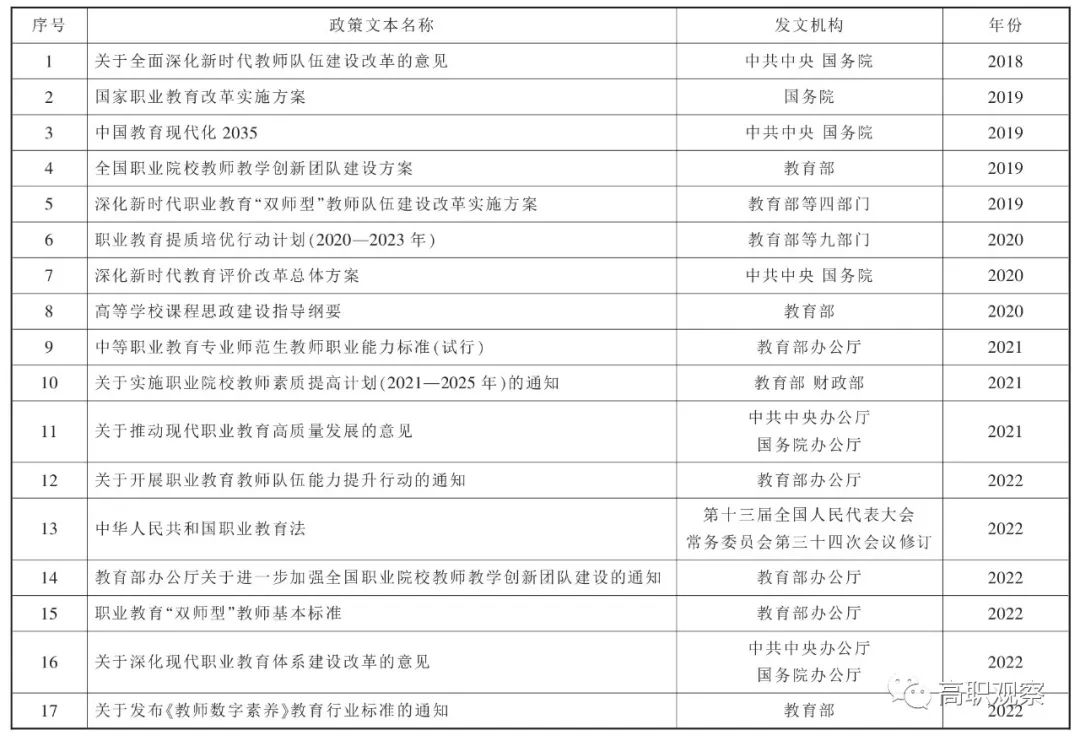 《中華人民共和國職業教育法》及國家有關職業教育、教師隊伍建設的文件制度規定了高職院校專業課教師的職責角色及職業教育人才培養要求。《中共中央國務院關于全面深化新時代教師隊伍建設改革的意見》是新中國成立以來黨中央出臺的第一個專門面向教師隊伍建設的里程碑式政策文件,因此本研究將此作為政策文本選取起點,以“職業教育”“教師”“課程思政”等為關鍵詞,在中央人民政府、教育部等官方網站檢索,共計梳理17個包括新職教法在內的政策文本,文本信息如表1所示。