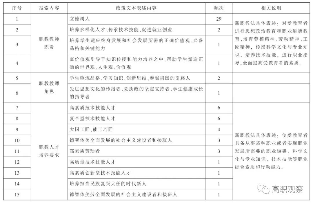 將上述政策文本中關于職教教師職責角色和人才培養要求表述內容進行整理后如表2所示。