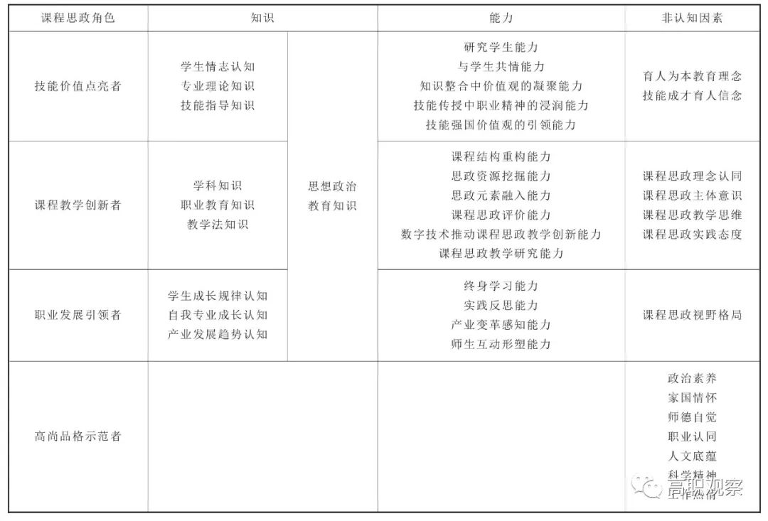 為進一步提煉出素養構成的核心概念,對高職院校專業課教師在課程思政中四種角色的素養構成要素進行反復比對分析,最終提取出綜合育人素養、德技融合素養、專業教學素養、共同成長素養、政治素養與人格修養等五大素養,從而基本完成高職院校專業課教師課程思政素養的建構。(節選自《職教論壇》2023年第10期)