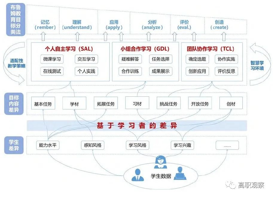 職業教育智慧教學,應當針對差異性不足的問題,運用生成性教學思維,以問題為導向、以任務為驅動,以“創造”為出發點和落腳點,創新教學模式,培養學生具有良好的價值取向、較強的職業技能、較好的思維品質和較深的創造潛能。對此,創新圖3所示的“SAL+GDL+TCL”教學模式,尊重學生差異,以“學材+習材+創材”和虛實融合學習場景為支撐,引導學生在個人自主學習(SAL,self autonomy learning)、小組合作學習(GDL,group difference learning)和團隊協作學習(TCL,team cooperation learning)中完成良構性(well-structured)的基本任務和拓展任務、劣構性(III-structured)的挑戰任務和開放任務,促進“知”和“行”不斷交互、深度耦合,學生由“學”轉為“學+習”,教師由“教學”轉為“教練”,實現智能高效、以學定教、轉識成智。
