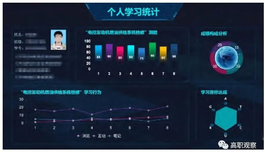 本課程發揮學習平臺的大數據統計分析功能,采集學生學習行為數據,按照“智能統計50%+作品評價30%+總結考核20%”,以可視化技術開展精準畫像(圖4),強調縱向比較,讓每個學生體驗自己的成長,從而杜絕了“放棄學”“刷量學”“雇人學”等現象,強化了過程性考核和作品評價。對學生的學習行為精準畫像,避免了“模糊分析”“一俊遮百丑”的弊端,促使每個學生都形成良好的個性,獲得成功體驗。這一評價模式促進了學生的自我反饋、自我調控、自我完善、自我認識。