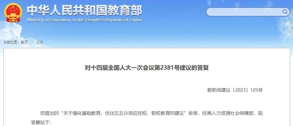 近日,教育部網站發布“對十四屆全國人大一次會議第2381號建議的答復”,就“關于強化基礎教育、優化五五分流后技校、職校教育的建議”作出答復。