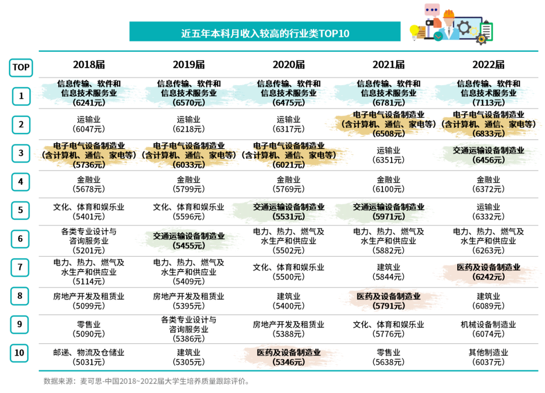 在電子電氣設備制造業(含計算機、通信、家電等)就業的應屆本科生,月收入從2018屆的5736元增至2022屆的6833元,漲幅19%,高于本科平均漲幅(17%),其位次從第3位升至第2位,說明該行業從業本科生起薪實現了“高位增長”。