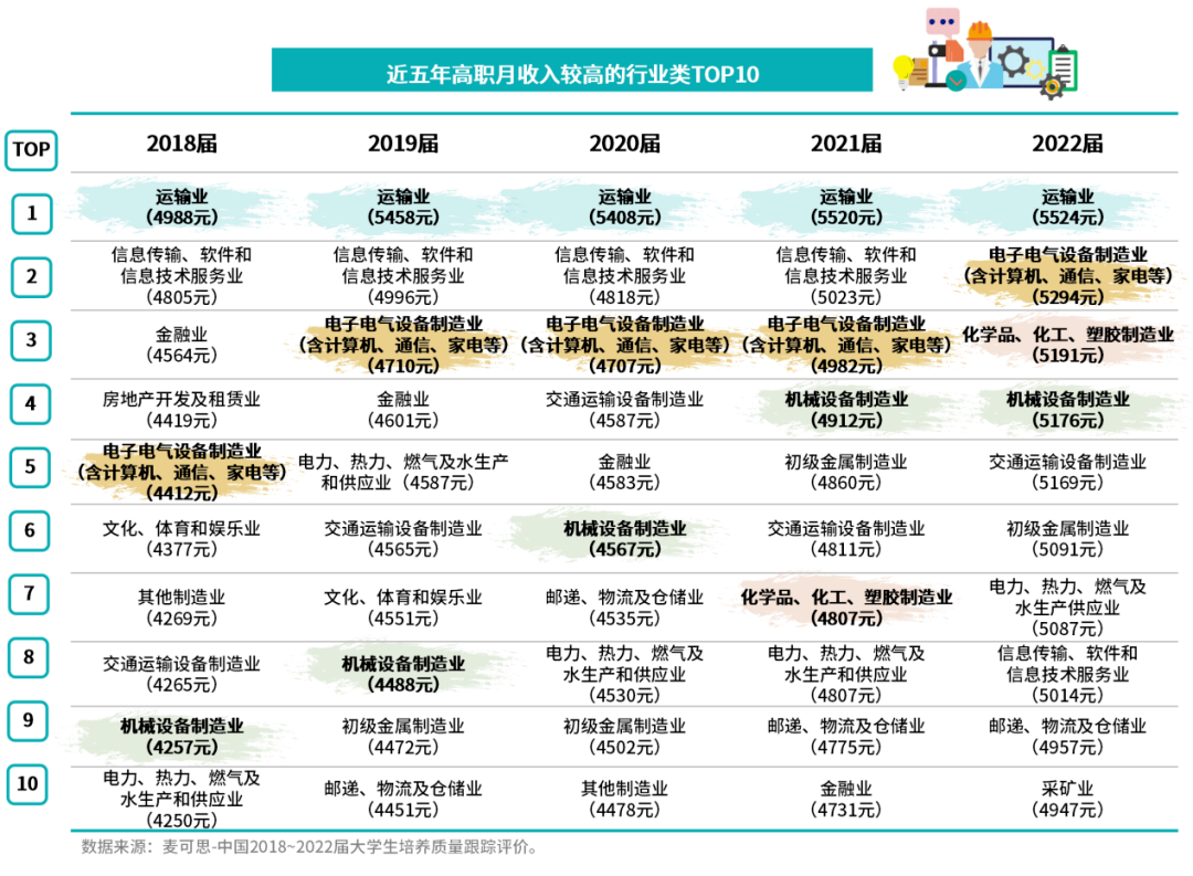 2022屆高職高薪行業榜中,其后排名較高的分別是電子電氣設備制造業(含計算機、通信、家電等)(5294元),化學品、化工、塑膠制造業(5191元),機械設備制造業(5176元),交通運輸設備制造業(5169元),初級金屬制造業(5091元),均屬于制造業。