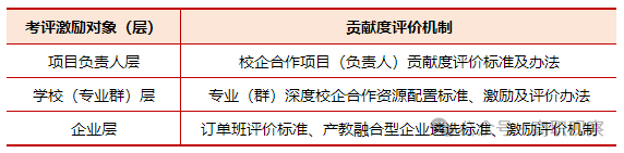 以合作案例為樣本,分析地方政府、行業協會、企業、學校、研究機構等成員利益坐標,利用“校企合作貢獻度”芝麻信用積分評價體系,在企業、學校(專業群)、項目負責人三個維度聯動開展分層分類評價,建立分配激勵機制,引導各方主動參與辦學,形成利益共同體。