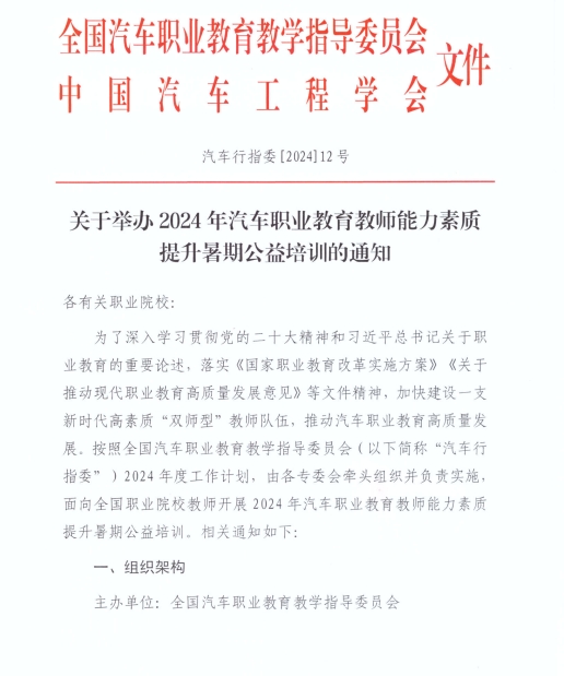 在熱情似火的7-8月間,由全國汽車職業教育教學指導委員會面向全國職業院校教師開展的 “2024年汽車職業教育教師能力素質提升暑期公益培訓” 系列活動,將在全國多地陸續舉辦,為廣大教師帶來一場知識與技能提升的盛宴。