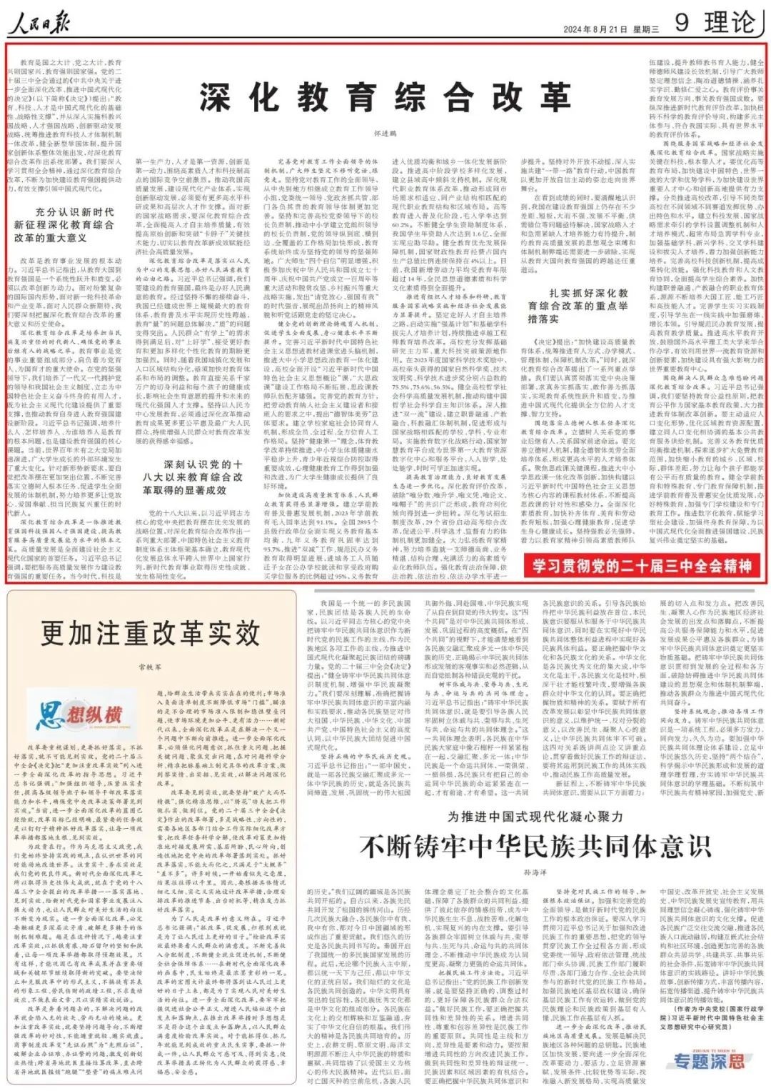 8月21日,《人民日報》“學習貫徹黨的二十屆三中全會精神”專欄,刊發教育部黨組書記、部長懷進鵬署名文章《深化教育綜合改革》。具體內容跟小編一起來看↓↓↓