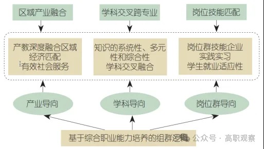 高職院校高水平專業(yè)群建設是一個復雜的過程,涉及到多重邏輯的交織。綜合當前高職院校專業(yè)群組群邏輯,可以概括為三個基本邏輯:產業(yè)導向邏輯、學科導向邏輯和崗位群導向邏輯。產業(yè)導向邏輯強調將專業(yè)群的設置與當地產業(yè)發(fā)展需求緊密對接,群內專業(yè)的內在關聯是基于區(qū)域某一特色產業(yè)導向而進行的專業(yè)集群。這意味著選擇專業(yè)和課程應基于對產業(yè)鏈中不同環(huán)節(jié)的需求分析,以確保人才培養(yǎng)及供給能適應未來職業(yè)市場變化與人才需求。產業(yè)導向邏輯強調產教深度的融合,以保持人才培養(yǎng)與產業(yè)發(fā)展的緊密聯系和無縫匹配。學科導向邏輯強調不同學科的知識與技能整合。專業(yè)群內的不同專業(yè)之間會有一定的學科交叉,通過跨學科合作,學生能夠獲得更全面的教育。學科導向邏輯注重知識的系統性、多元性和綜合性,以培養(yǎng)具備跨學科背景的綜合型人才。崗位群導向邏輯強調將學生的培養(yǎng)與實際工作崗位的需求相匹配。群內專業(yè)是基于崗位群對專業(yè)人才的崗位技能需求而進行的專業(yè)集群。通過與各類崗位群的合作不斷調整專業(yè)群課程設置和人才培養(yǎng)目標,以確保畢業(yè)生具備符合不同崗位需求的復合型高素質技術技能和綜合職業(yè)素養(yǎng)。