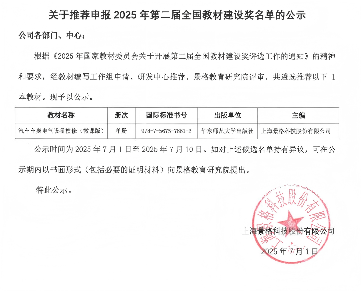 根據《2025年國家教材委員會關于開展第二屆全國教材建設獎評選工作的通知》的精神和要求,經教材編寫工作組申請、研發中心推薦、景格教育研究院評審,共遴選推薦以下 1本教材。現予以公示。