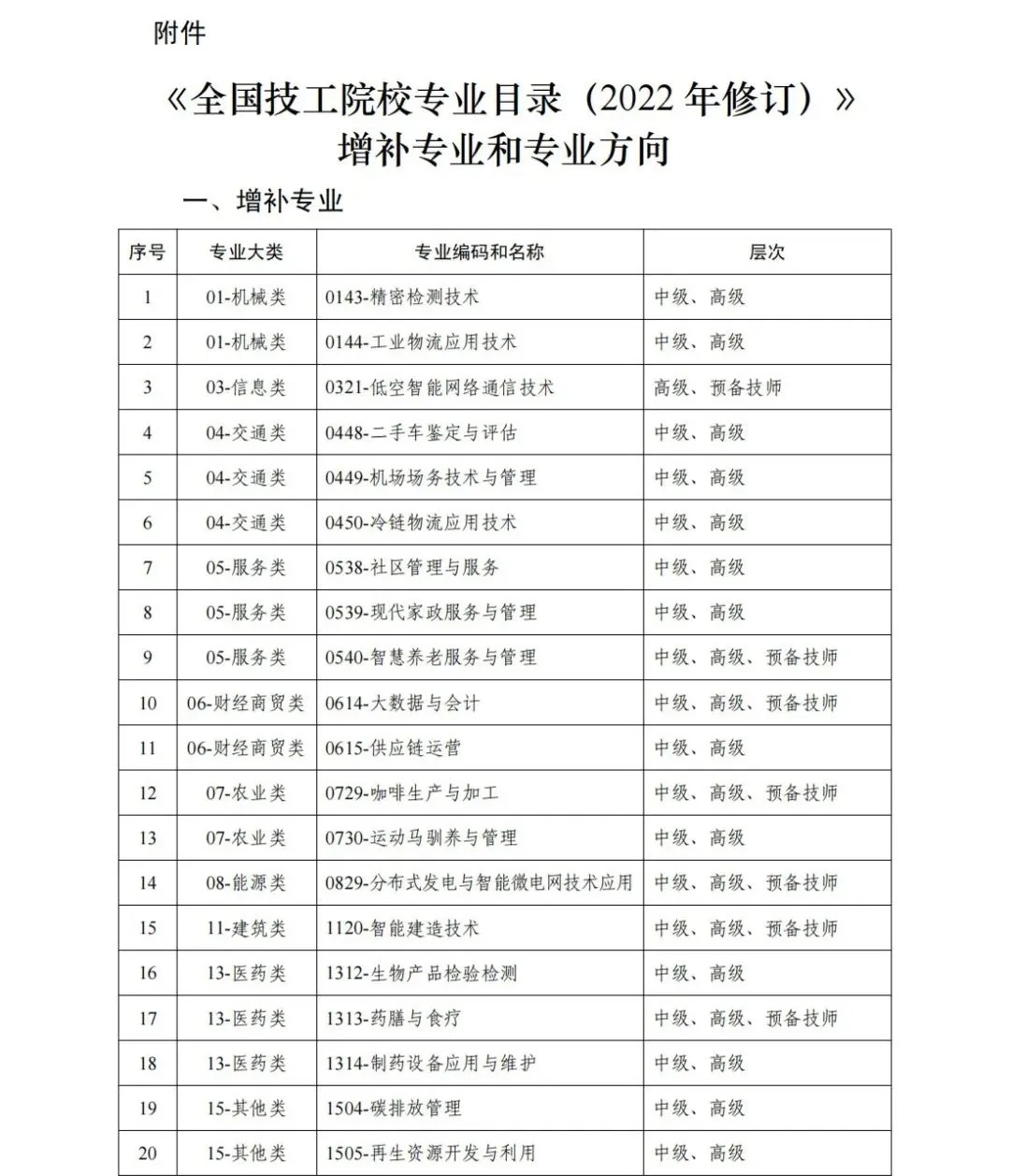 為貫徹落實《關于加強新時代高技能人才隊伍建設的意見》,根據《技工教育“十四五”規劃》部署,加強技工院校專業建設,我部組織開展了《全國技工院校專業目錄(2022年修訂)》增補工作。經廣泛征求意見,組織專家研究論證,確定新增20個專業,新增列舉7個專業方向,現予公布。
