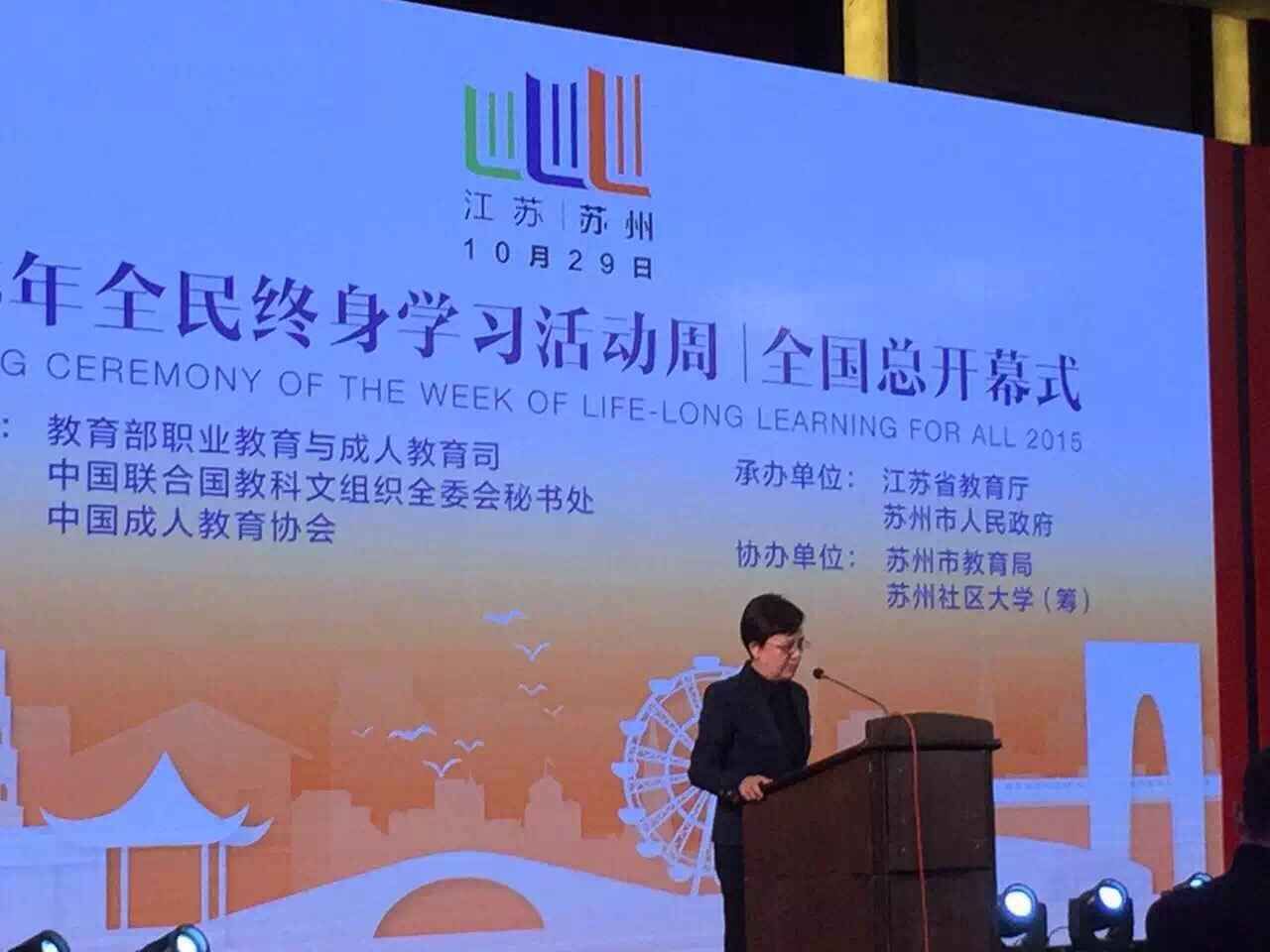 10月29日上午,由教育部職業(yè)教育與成人教育司、中國教科文組織全委會秘書處、中國成人教育協(xié)會聯(lián)合主辦,江蘇省教育廳、蘇州市人民政府承辦的2015年全民終身學習活動周全國總開幕式在江蘇省蘇州市舉行。