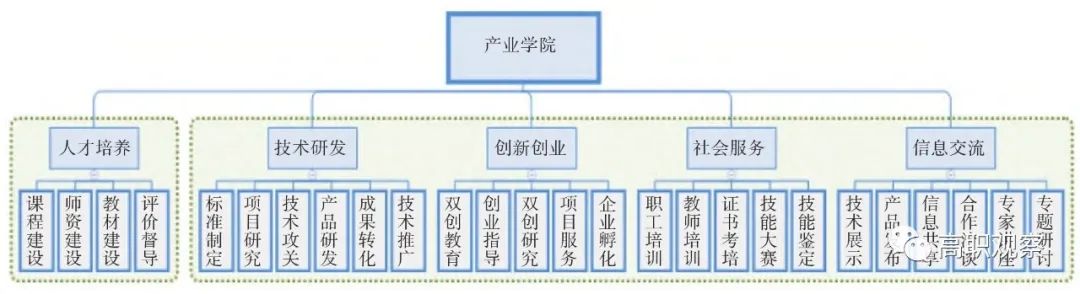 產業學院是一種以產業需求為邏輯起點,多元主體共同建設、共享資源、共擔風險、合作共贏,產教深度融合的辦學形態。結合產業學院的具體實踐,其功能定位應為人才培養、技術研發、創新創業、社會服務和信息交流等,按照各功能所處的地位不同,將其概括為1+N范式