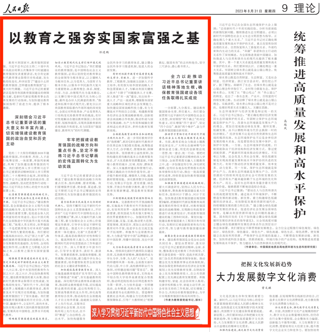 8月31日,教育部黨組書記、部長懷進鵬在《人民日報》“深入學習貫徹習近平新時代中國特色社會主義思想”專欄撰文《以教育之強夯實國家富強之基》。