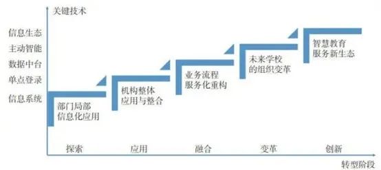 教育數字化轉型包括技術、業務、人本三個層面,在轉型過程中會歷經部門局部信息化應用、機構整體應用與整合、業務流程服務化重構、未來學校的組織變革、智慧教育服務新生態的關鍵階段,形成遞進型的轉型路徑。